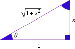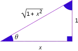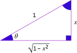 Se tabulan a continuación las funciones trigonométricas de las funciones trigonométricas inversas. Una forma rápida de deducirlas es considerando la geometría de un triángulo rectángulo, con un lado de longitud 1 y otro lado de longitud x, aplicando a continuación el teorema de Pitágoras y las definiciones de las razones trigonométricas. Las deducciones puramente algebraicas son más largas. Vale la pena señalar que para arco secante y arco cosecante, el diagrama asume que x es positivo, y por lo tanto, el resultado debe corregirse mediante el uso de valores absolutos y la operación signo (sgn).