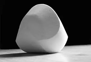 La solución más famosa tiene una parte superior afilada, como se muestra en la imagen. Su forma ayudó a explicar la estructura corporal de algunas tortugas en relación con su capacidad para volver a la posición de equilibrio después de colocarse al revés.[1][2][3][4] Se han donado copias de gömböc a diversas instituciones y museos, y la más grande se presentó en la Exposición Universal 2010 en Shanghái, China.[5][6] En diciembre de 2017, se instaló una escultura de 4.5 m de altura de un gömböc en el Barrio Corvin en Budapest, Hungría.[7]