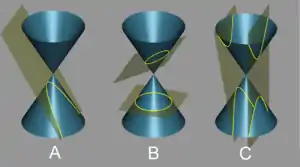 El resultado de la intersección de la superficie de un cono, con un plano, da lugar a lo que se denominan secciones cónicas, que son: la parábola, la elipse (la circunferencia es un caso particular de elipse) y la hipérbola.