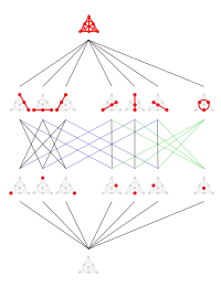 - Cada color representa el día de la semana (siete colores, azul, verde, amarillo, púrpura, rojo, negro y naranja). La definición de un espacio de Fano afirma que cada recta posee tres puntos. La figura representa esto con rectas de tres puntos cada una. Esto es la base para la solución de las escolares. Esta figura es por tanto rotada 7 veces. Hay 5 rectas diferentes para cada día, multiplicado por 7 (días), el resultado es 35. Luego, hay 15 puntos y también 7 rectas que nacen en cada punto. Entonces, esto da la representación del espacio de Fano.