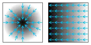 - Considere una habitación en la cual la temperatura se define a través de un campo escalar, de tal manera que en cualquier punto , la temperatura es . Asumiremos que la temperatura no varía con respecto al tiempo. Siendo esto así, para cada punto de la habitación, el gradiente en ese punto nos dará la dirección en la cual la temperatura aumenta más rápido. La magnitud del gradiente nos dirá cuan rápido aumenta la temperatura en esa dirección.