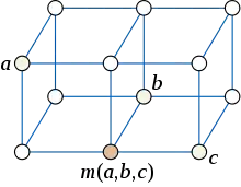 En un retículo distributivo, la siguiente operación mediana autodual de tres parámetros, descrita por Birkhoff:[7]
