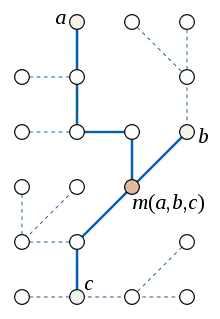 - un camino en sí mismo, en cuyo caso la mediana m(a,b,c) es igual a uno de los nodos a, b o c, dado que alguno de ellos se encontrará entre los otros dos en el camino, o bien
