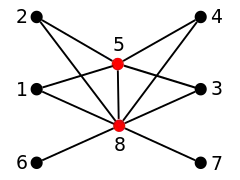 Por ejemplo, el grafo de la figura es un grafo umbral. Puede construirse comenzando con el vértice 1, y luego añadiendo vértices negros como vértices aislados y vértices rojos como vértices dominantes, siguiendo el orden en que están enumerados.