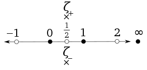 - 3 puntos arbitrarios se transforman convencionalmente a [0, 1], [1, 1], [1, 0]; en notación alternativa, 0, 1, ∞. En notación de transformación lineal fraccionaria, la función mapea a ↦ 0, b ↦ 1, c ↦ ∞, y es la única aplicación de este tipo que lo hace. Esta es la razón anarmónica (x, b; a, c); consúltese relación cruzada: enfoque transformacional para obtener más detalles.