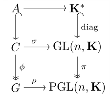 - PGL (n, K) es un grupo algebraico de dimensión n2 − 1 y un subgrupo abierto del espacio proyectivo Pn2−1. Como se define, el funtor PSL (n, K) no define un grupo algebraico, ni siquiera un haz fppf, y su haz en la topología fppf es de hecho PGL (n, K).