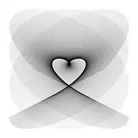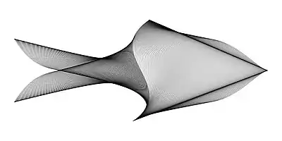 Los 500 segmentos de línea definidos arriba definen una forma en el plano cartesiano que se asemeja a un pájaro en vuelo. Los segmentos en las alas del pájaro producen un ilusión óptica y pueden engañar al espectador haciéndole pensar que son curvos, cuando en realidad son rectos. Por lo tanto, la forma también se puede considerar como un obra de op-art.[31][7][11][37][34][38] Otra versión de Un pájaro en vuelo que fue diseñada por el segundo método es la unión de todos los círculos con centro y radio , donde , y