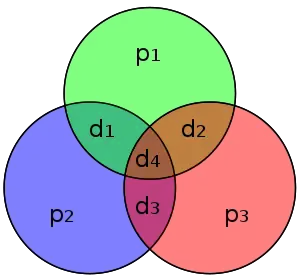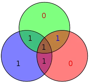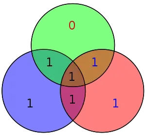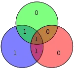 El diagrama de la derecha muestra el error de bit (mostrado en texto azul) y la paridad incorrecta creada (mostrada en texto rojo) en los círculos rojo y verde. El error de bit se puede detectar calculando la paridad de los círculos rojo, verde y azul. Si se detecta una paridad incorrecta, el bit de datos que se superpone solo a los círculos de paridad incorrecta es el bit con el error. En el ejemplo anterior, los círculos rojo y verde tienen mala paridad, por lo que el bit correspondiente a la intersección de rojo y verde, pero no azul, indica el bit con el error.