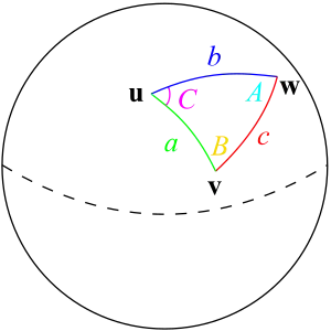 Como se trata de una esfera unitaria, las longitudes a, b y c son simplemente iguales a los ángulos centrales (en radianes) que los definen a partir del centro de la esfera (para una esfera no unitaria, cada una de estos arcos es igual a su ángulo central multiplicado por el radio de la esfera).