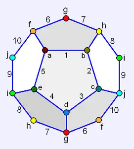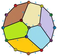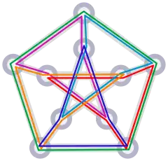 Las seis caras del hemidodecaedro representadas como ciclos de colores en el grafo de Petersen