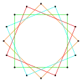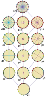 Las 14 simetrías de un hexadecágono regular. Los ejes de simetría azules atraviesan vértices, los violetas pasan por el centro de los lados y el número de simetrías de giro se indican en el centro. Los vértices están coloreados según su posición de simetría. |