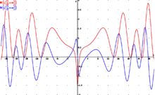 Parte real (rojo) y parte imaginaria (azul) de la línea crítica Re(s) = 1/2 de la función zeta de Riemann. Pueden verse los primeros ceros no triviales en Im(s) = ±14,135, ±21,022 y ±25,011.