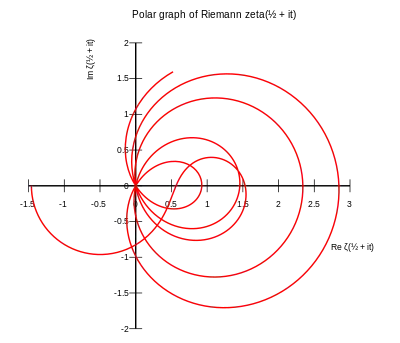 Un gráfico polar de zeta, esto es, Re(zeta) vs. Im(zeta), a lo largo de la línea crítica s=it+1/2, con t con valores desde 0 a 34.