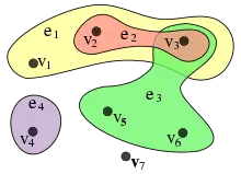 Formalmente, un hipergrafo es un par ordenado , donde es un conjunto finito de vértices o puntos, también llamado conjunto base, y es el conjunto de hiperaristas, a veces llamadas simplemente aristas, correspondiente a una familia de subconjuntos de , es decir, a un subconjunto de , que es el conjunto potencia de .[1] De acuerdo con la definición original, las hiperaristas no pueden ser vacías.[2]