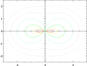 - Cuando d < 0, la curva se asemeja a una figura con forma de ocho, o lemniscata, y en ocasiones se denomina lemniscata de Booth (ambas en referencia al matemático del siglo XIX James Booth, que estudió estas curvas).