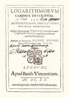 El método de los logaritmos fue propuesto públicamente por John Napier en 1614, en un libro titulado Mirifici Logarithmorum Canonis Descriptio (Descripción de la maravillosa regla de los logaritmos).[18][19]