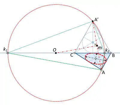 - Dibujar la circunferencia con centro en O y que pasa por A' y por A, que corta la recta BC en k1 y k2.