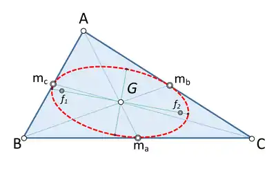 En geometría, la inelipse de Steiner,[1] inelipse de los puntos medios o simplemente elipse de los puntos medios de un triángulo, es la única elipse inscrita en el triángulo y que es tangente a los lados en su puntos medios. Es un ejemplo de una incónica. En comparación, la circunferencia inscrita y la inelipse de Mandart de un triángulo son otros elementos tangentes a los lados, pero no a los puntos medios (a menos que el triángulo sea equilátero). La inelipse de Steiner fue atribuida por Dörrie[2] a Jakob Steiner, y Kalman[3] dio una prueba de su singularidad.