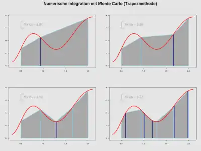 Los métodos de Montecarlo y métodos de cuasi-Montecarlo son fáciles de aplicar a integrales multidimensionales, y pueden producir una mejor exactitud por el mismo número de evaluaciones de la función que en integraciones repetidas empleando métodos unidimensionales. Una clase grande de métodos útiles de Montecarlo son los llamados algoritmos de Cadena de Markov de Montecarlo, los cuales incluyen el algoritmo de Metropolis-Hastings y muestreo de Gibbs.