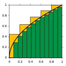 Una primera aproximación, aunque no muy precisa, para obtener esta área, consiste en determinar el área del cuadrado unidad cuyo lado lo da la distancia desde x=0 hasta x=1 o también la longitud entre y=f(0)=0 y y=f(1)=1. Su área es exactamente 1x1 = 1. Tal como se puede inferir, el verdadero valor de la integral tendrá que ser más pequeño. Particionando la superficie en estudio, con trazos verticales, de tal manera que vamos obteniendo pequeños rectángulos, y reduciendo cada vez más el ancho de los rectángulos empleados para hacer la aproximación, se obtendrá un mejor resultado. Por ejemplo, dividamos el intervalo en cinco partes, empleando los puntos 0, 15, 25,35,45 y finalmente la abscisa 1. Se obtienen cinco rectángulos cuyas alturas se determinan aplicando la función con las abscisas anteriormente descritas (del lado derecho de cada pedazo de la curva), así , , … y así hasta . Sumando las áreas de estos rectángulos, se obtiene una segunda aproximación de la integral que se está buscando,