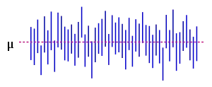 La figura ilustra 50 realizaciones de un intervalo de confianza para una población media dada μ. Si aleatoriamente se selecciona una realización, la probabilidad es del 95% de finalmente haber elegido un intervalo que contenga el parámetro; sin embargo, podría darse la desafortunada situación de haber elegido la errónea.