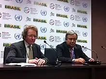 ![]() El rector de la UNU, Osterwalder, con el comisario del ACNUR, Gutteres, en la conferencia de prensa de Río+20 | ||