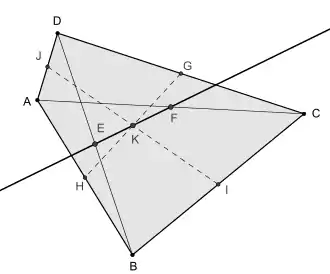 Los segmentos GH e IJ que unen los puntos medios de lados opuestos (las bimedianas) de un cuadrilátero convexo, se cortan en un punto que se encuentra en la línea de Newton. Este punto K biseca el segmento de la línea EF que conecta los puntos medios de las dos diagonales.[1]