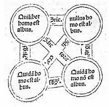 El Organon fue el conjunto de trabajos de Aristóteles sobre lógica, constituyendo los Primeros analíticos el primer trabajo explícito de lógica formal, introduciendo la silogística.[34] Las partes de la lógica silogística, también conocida con el nombre de lógica de términos, son el análisis de los juicios en proposiciones que consisten en dos términos que están relacionados por una de un número fijo de relaciones, y la expresión de inferencias mediante silogismos que consisten en dos proposiciones que comparten un término común como premisa, y una conclusión que es una proposición que involucra los dos términos no relacionados de las premisas.