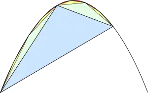 Por extensión, cada uno de los triángulos amarillos tiene un octavo del área del triángulo verde, cada uno de los triángulos rojos tiene un octavo del área del triángulo amarillo y así sucesivamente. Usando el método exhaustivo se comprueba que el área total del segmento parabólico está dada por