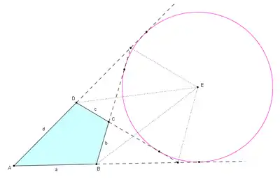 Un cuadrilatero extratangencial permite trazar una circunferencia que es tangente a los cuatro lados extendidos. El excentro (centro del círculo tangente) se encuentra en la intersección de las seis bisectrices: las bisectrices de los ángulos interiores de dos vértices opuestos, las bisectrices de los ángulos suplementarios exteriores de los otros dos vértices y las bisectrices externas de los ángulos formados donde las extensiones de lados opuestos se cruzan.