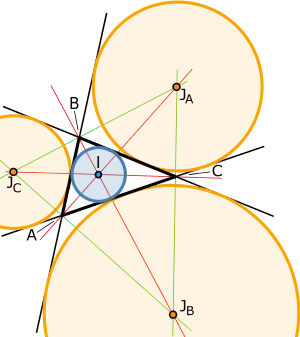 Las circunferencias exinscritas de un triángulo, así como las incónicas del triángulo que no son elipses, son externamente tangentes a un lado del triángulo y a los otros dos lados extendidos.