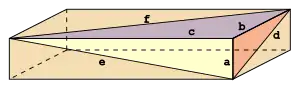donde a, b, c son las aristas y d, e, f son las diagonales.