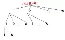 Este grafo es un árbol. Su raíz es el vector vacío correspondiente a . sus hojas son o bien soluciones (), o posiciones sin salida (). Las soluciones del problema de las ocho reinas se pueden obtener explorando este árbol. Sin embargo, no generamos explícitamente el árbol para explorarlo después. Los nodos se van generando y abandonando en el transcurso de la exploración mediante un recorrido en profundidad.