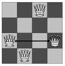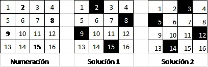A continuación se da el ejemplo de las dos soluciones de un tablero de 4 x 4 (marcadas en las casillas negras), es decir n = 4
