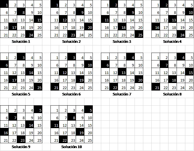 A continuación se da el ejemplo de las diez soluciones de un tablero de 5 x 5 (marcadas en las casillas negras), es decir n = 5