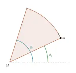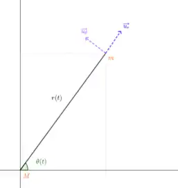 donde denota la posición del cuerpo con masa en el instante ; el cuerpo con masa está quieto y en el origen; y y son vectores unitarios en las direcciones radial y circunferencial, respectivamente; y es el ángulo que forma con el eje polar (eje de referencia desde el que se mide el ángulo polar).