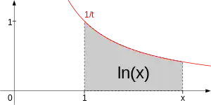 Desde el punto de vista analítico, el logaritmo natural puede definirse para cualquier número real positivo como el área bajo la curva entre las rectas y . La sencillez de esta definición es la que justifica la denominación de «natural» para el logaritmo con esta base concreta.[2] Esta definición puede extenderse a los números complejos.