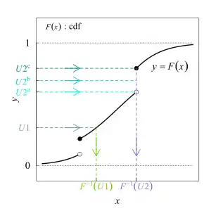 Este teorema muestra que para generar una variable aleatoria a partir de la función de distribución continua , generemos un número aleatorio y hacemos entonces .