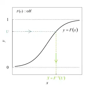 Sea una variable aleatoria uniforme en , para cualquier función de distribución continua invertible , la variable aleatoria definida como tiene distribución , donde se define como el valor de tal que .