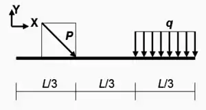 Para las cargas mostradas en la figura adjunta sobre una barra o viga bidimensional el vector de fuerzas nodales consiste en dos fuerzas verticales (FVd, FVi) aplicadas en cada uno de los dos extremos, dos fuerzas horizontales (FHd, FHi) aplicadas en cada uno de los extremos y dos momentos de fuerza (Md, Mi) aplicados en cada uno de los extremos. Esas seis componentes forman el vector de fuerzas nodales. Es sencillo comprobar que la fuerza y el momento resultantes de estas seis componentes son estáticamente equivalentes al sistema de fuerzas original formado por P y q si se toman los siguientes valores: