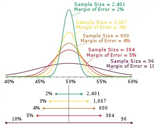 Sea una encuesta simple del tipo si/no, es una muestra de encuestados tomados de una población de que indica un porcentaje de respuestas si. Se desea saber cuan cercano se encuentra del verdadero resultado de la encuesta de toda la población , sin que tener que realizar una. Si, hipotéticamente, realizáramos una encuesta sobre muestras subsecuentes de encuestados (tomados nuevamente de ), es que es de esperar que los resultados subsecuentes se encuentren distribuidos en forma normal alrededor de . El margen de error describe la distancia dentro de la cual el porcentaje especificado de estos resultados es de esperar varíe de .