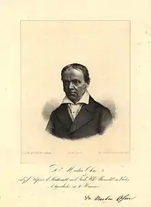 Martin Ohm (1792–1872) fue un matemático alemán, hermano menor del físico Georg Simon Ohm. Se doctoró en 1811 en la Universidad de Erlangen-Nuremberg, donde su asesor fue Karl Christian von Langsdorf. Ohm fue el primero en desarrollar plenamente la teoría del exponencial ab cuando tanto a como b son números complejos en 1823.[1] También se le da el crédito de haber introducido el nombre de sección áurea (goldener Schnitt)[2]