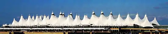 El edificio de la terminal del Aeropuerto Internacional de Denver, terminado en 1995, tiene una cubierta laminar suspendida configurada como una superficie mínima (es decir, su curvatura media es cero) mediante cables de acero. Evoca las montañas nevadas de Colorado y las tiendas de campaña (tipis) de los nativos norteamericanos.[48][49]