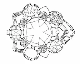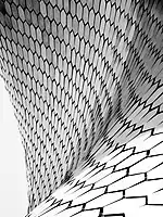 - Se consideró un embaldosado aperiódico, para evitar el ritmo de una rejilla estructural, pero en la práctica, utilizar un teselado de Penrose era demasiado complejo, por lo que se eligió una retícula de 2,625 m en horizontal y 4,55 m en vertical.[115]