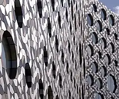 Hacia finales del siglo XX, los arquitectos recurrieron a nuevas construcciones matemáticas como la geometría fractal y el mosaico aperiódico con el fin de obtener revestimientos novedosos y atractivos para sus edificios.[4] En 1913, el arquitecto modernista Adolf Loos había declarado que "El ornamento es un crimen", influyendo[113] en el pensamiento arquitectónico durante el resto del siglo XX. En el siglo XXI, los arquitectos están comenzando nuevamente a explorar el uso de la ornamentación, que se ha convertido en un elemento extremadamente diverso. El edificio Harpa, construido en Reikiavik en 2011 por Henning Larsen, incluye lo que parece una pared de cristal de roca compuesta a base de grandes bloques de vidrio.[113] Un edificio de Londres, el Ravensbourne College de la firma Foreign Office Architects (2010), está teselado decorativamente con 28.000 baldosas de aluminio anodizado en rojo, blanco y marrón, dejando paso a ventanas circulares entrelazadas de diferentes tamaños. La teselación utiliza tres tipos de mosaicos, un triángulo equilátero y dos pentágonos irregulares.[114][115][116] La Biblioteca Umimirai de Kanazawa, proyectada por Kazumi Kudo, crea una rejilla decorativa hecha de pequeños bloques circulares de vidrio colocados sobre paredes de hormigón liso.[113]