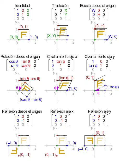 Efecto de aplicar varias matrices de transformación afín 2D sobre un cuadrado unitario (de lado 1). Téngase en cuenta que las matrices de reflexión son casos especiales de la matriz de escala