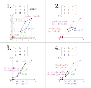 Cuando se utilizan transformaciones afines, la componente homogénea de un vector de coordenadas (normalmente denominada w) nunca se modifica. Por lo tanto, se puede asumir con seguridad que siempre es 1 e ignorarlo. Sin embargo, esto no es cierto cuando se utilizan proyecciones en perspectiva.