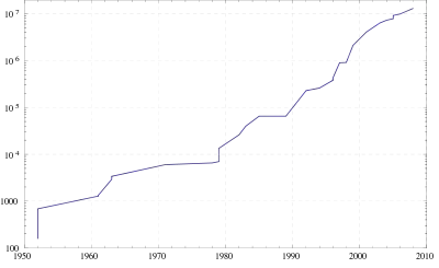 El uso de computadoras electrónicas aceleró los descubrimientos y todos los récords fueron encontrados desde 1951. El récord pasó el millón de dígitos en 1999, ganando un premio de 50,000 $.[4] En 2008 el récord pasó los diez millones de dígitos, siendo premiado con 100,000 $.[5] También se han ofrecido premios para el primer número primo encontrado que tenga al menos cien millones de dígitos y el primero que tenga mil millones de dígitos.[1]