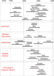 Además, el desarrollo de numerosas instalaciones de prueba y con medios de medición posibilitó obtener numerosos resultados. No todos ellos pudieron ser explicados por la teoría y se vio aparecer una gran cantidad de números adimensionales que explicaban y justificaban las pruebas realizadas sobre maquetas en un túnel de viento o en un tanque de carena. Dos mundos científicos coexistieron y muy a menudo se ignoraronn hasta finales del siglo XIX.[18][19] Esa brecha desaparecerá bajo el impulso de personas como Theodore von Kármán o Ludwig Prandtl a principios del siglo XX. Todos esos desarrollos estaban respaldados por desarrollos en la industria: hidrodinámica industrial, construcción naval y aeronáutica.