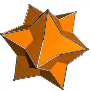 Este sólido es al compuesto de pequeño dodecaedro estrellado y gran dodecaedro lo que la envolvente convexa es al compuesto de dodecaedro e icosaedro: las aristas cruzadas en el politopo compuesto son las diagonales de los rombos.